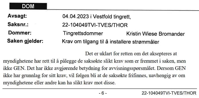 Retten anerkjente at forskriften pålegger nettselskapet å installere AMS-komponenten. Men den fastslo også at nettleieavtalen ikke inneholdt noe vilkår som forpliktet kunden til å godta en måler med AMS. Nettselskapet måtte dermed gå rettens vei for å få hjemmel for tvangsinstallasjon. Dette ble ikke fulgt opp av nettselskapet, og saken avslørte et klart skille mellom det offentligrettslige ansvaret for AMS og kundens rettigheter etter privatrettslig avtale.