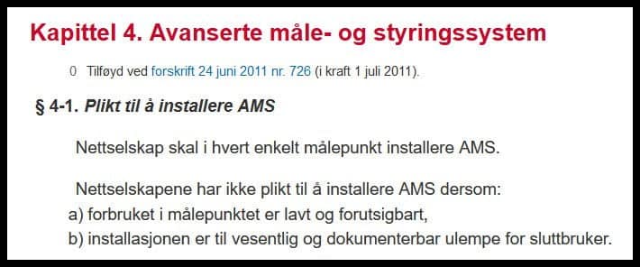 Du snakker om en AMS-måler er et måleutstyr. Hvor har du AMS-måler ifra? Hva skal den måle, AMS? Energi Norge ved Møller har ikke skjønt hva det faktisk innebærer av en installasjon hos sluttbruker etter avregningsforskriften § 4-1.Plikt til å installere AMS. Den sier ingenting om en måler. NVE har aldri pålagt nettselskapene å bytte måleren hos kunden. § 4-1 sier at nettselskapene skal installere «Avanserte måle- og styringssystem» (hva nå enn forskriften mener dette skal inkludere) på alle målepunkter. Til å være ett påbud er det ikke akkurat særlig spesifisert. For det hverken inkluderer noe spesifikt, eller ekskluderer noe.