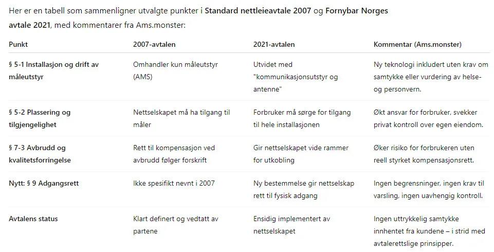 Sammenligning av Standard nettleieavtale 2007 og Fornybar Norges avtale 2021, med kommentarer fra Ams.monster: