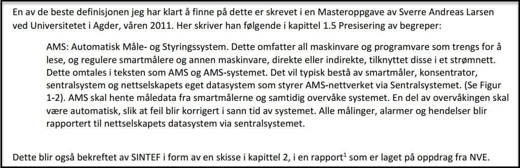 Du snakker om en AMS-måler er et måleutstyr. Hvor har du AMS-måler ifra? Hva skal den måle, AMS? Energi Norge ved Møller har ikke skjønt hva det faktisk innebærer av en installasjon hos sluttbruker etter avregningsforskriften § 4-1.Plikt til å installere AMS. Den sier ingenting om en måler. NVE har aldri pålagt nettselskapene å bytte måleren hos kunden. § 4-1 sier at nettselskapene skal installere «Avanserte måle- og styringssystem» (hva nå enn forskriften mener dette skal inkludere) på alle målepunkter. Til å være ett påbud er det ikke akkurat særlig spesifisert. For det hverken inkluderer noe spesifikt, eller ekskluderer noe.