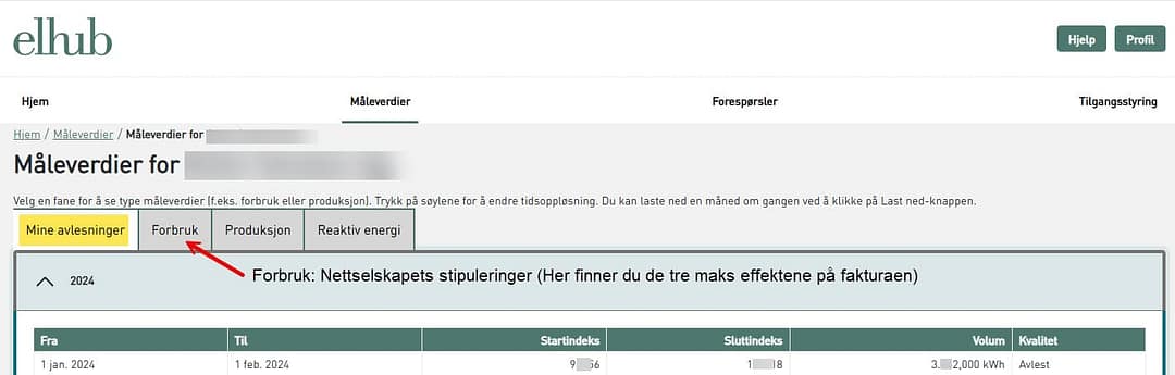 Under fanen «Forbruk» finner du også nettselskapets stipulerte verdier. Det er viktig å merke seg at dette ikke er sanntidsdata hentet automatisk fra måleren, men beregnede estimater basert på tidligere forbruk. Les mer om høye timesverdier og hvordan du kan unngå feilaktige stipuleringer på profilavregnede målepunkt.